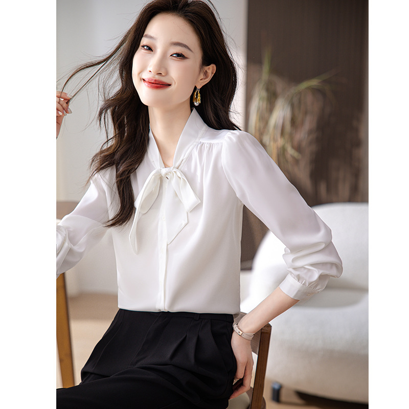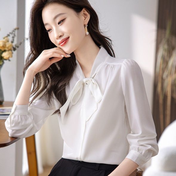 通勤スタイルにもデイリーコーディネートにも取り入れやすい、大人のためのリボン付き白シャツブラウスです。