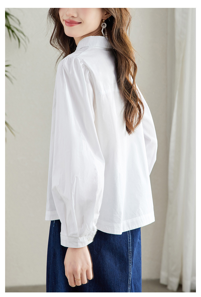袖口にギャザーを施したボリューム感のあるデザインが特徴で、シンプルながらも女性らしい華やかさを演出します。