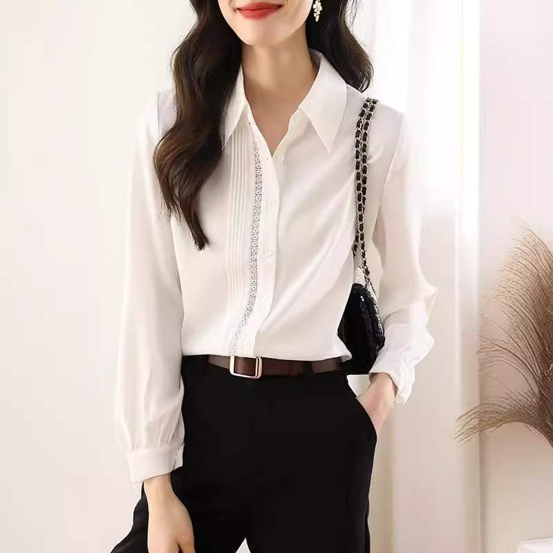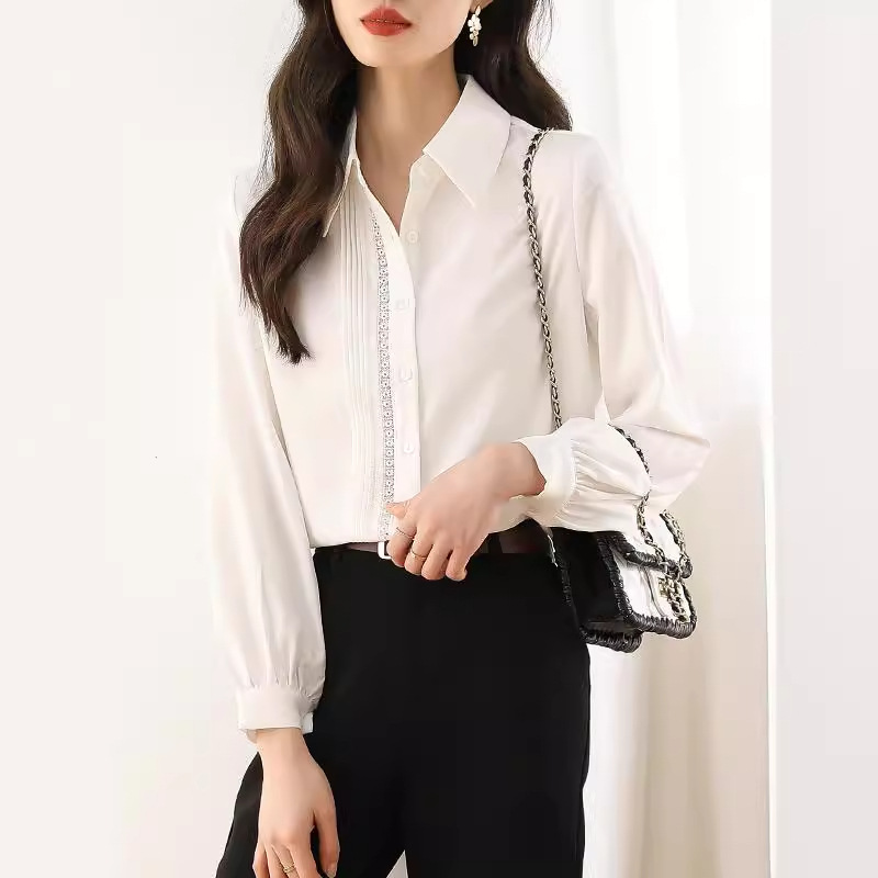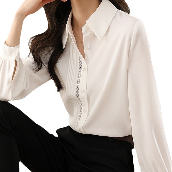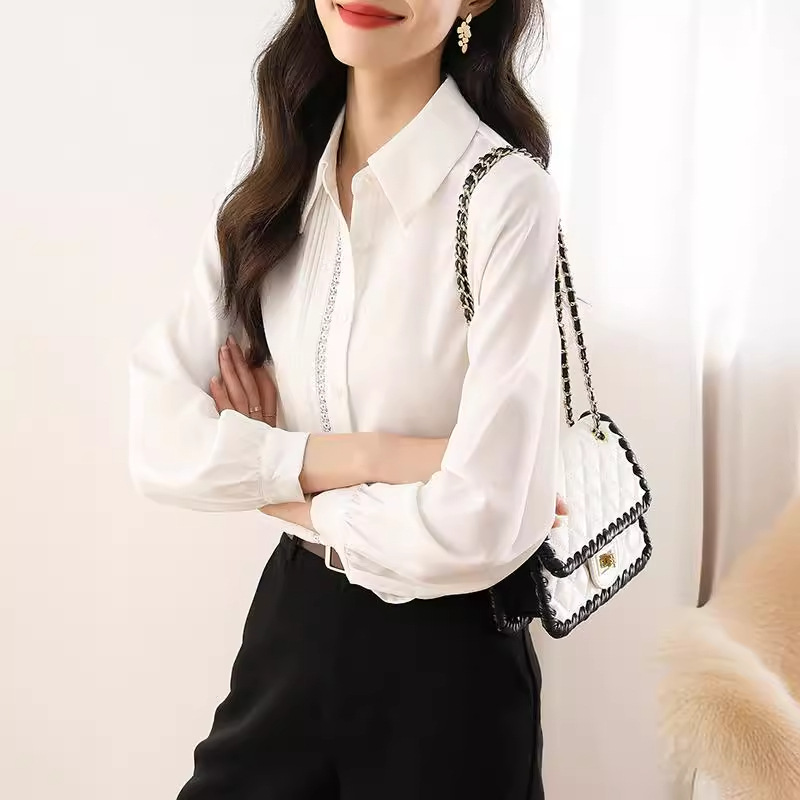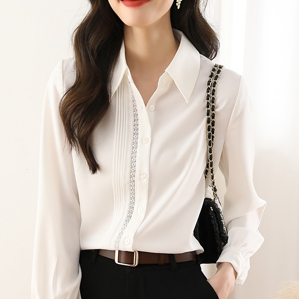 胸元のピンタックと煌めくビジュー装飾が上品な印象を与える白シャツです。