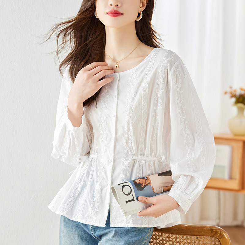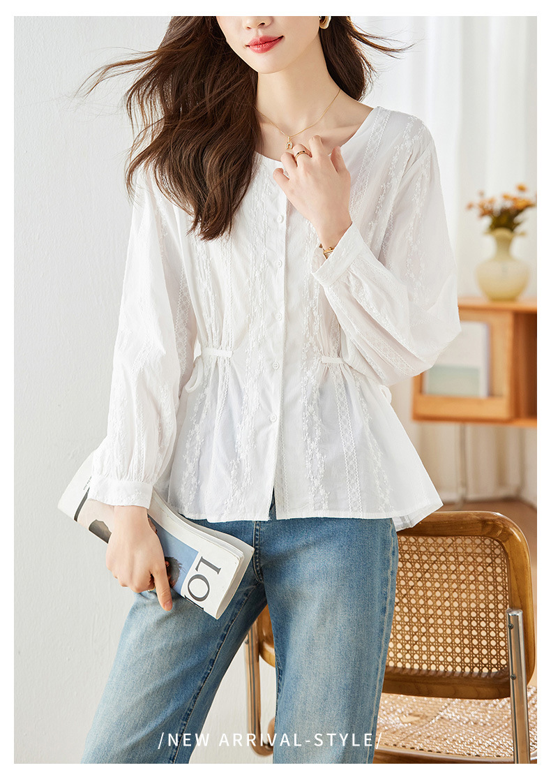 繊細なレースが縦ラインに施された上品な白シャツです。