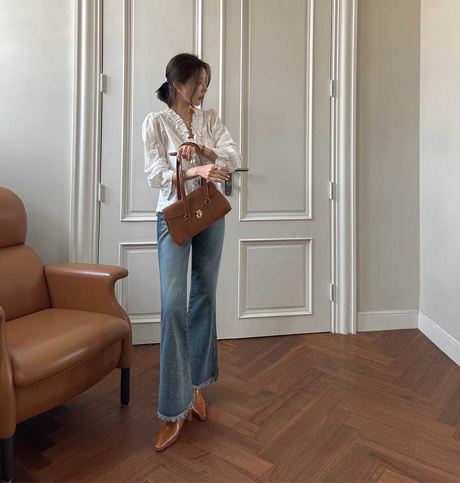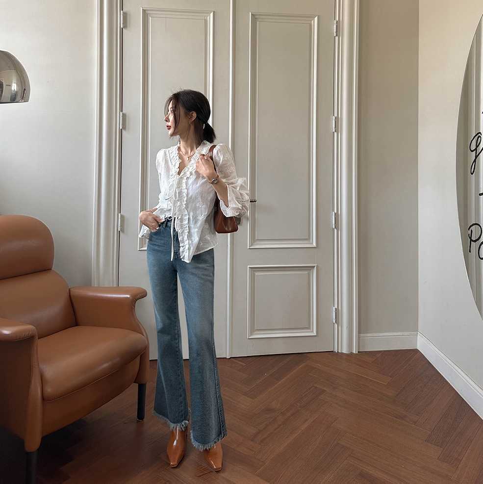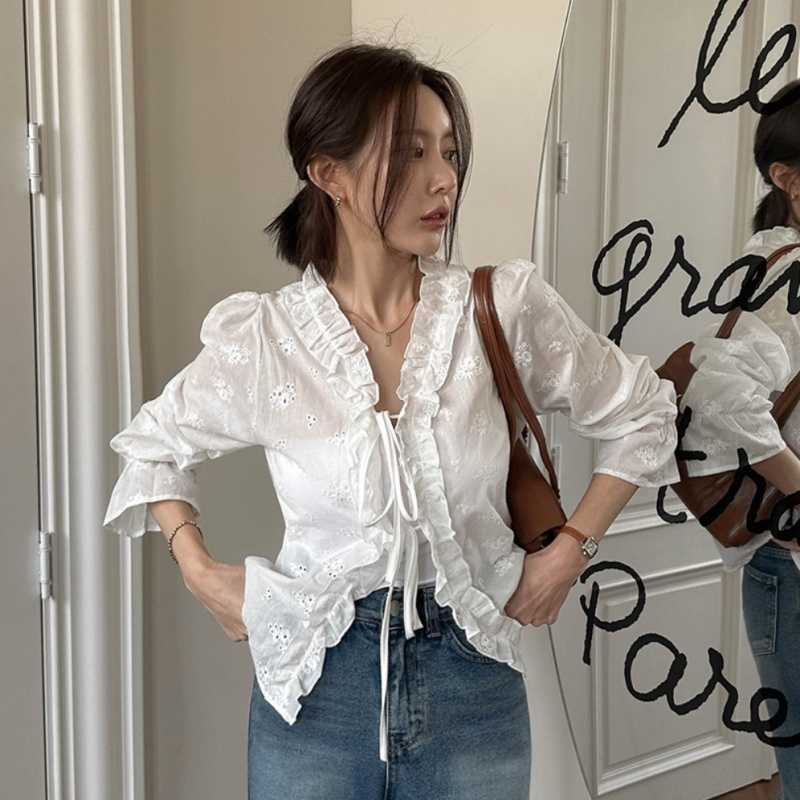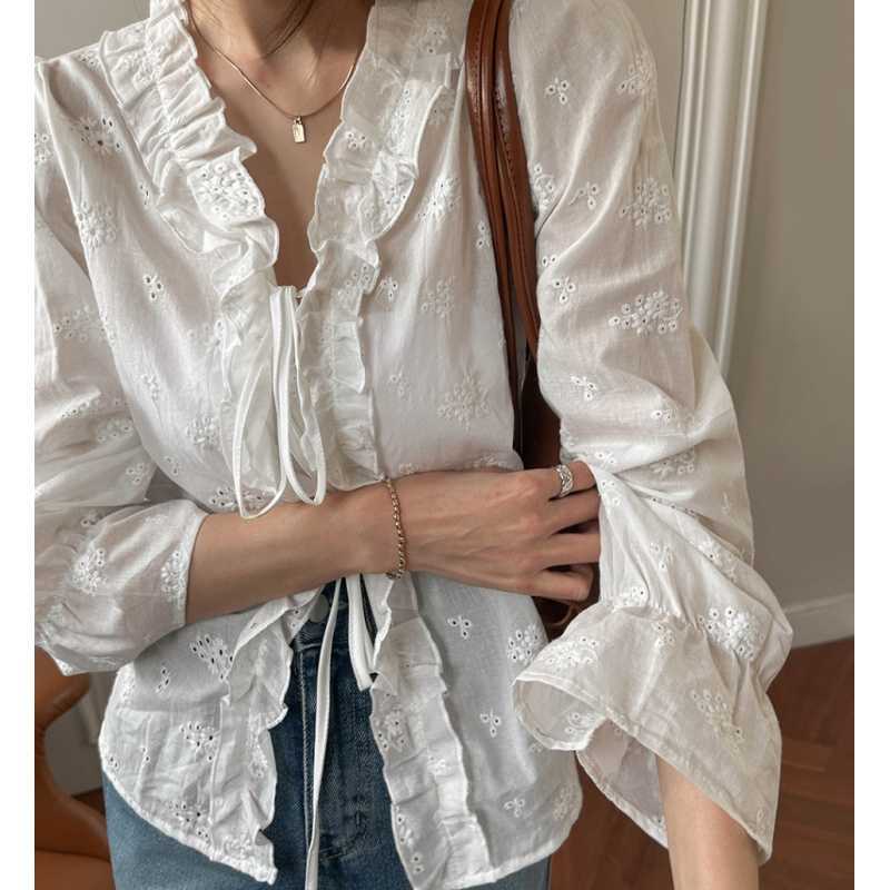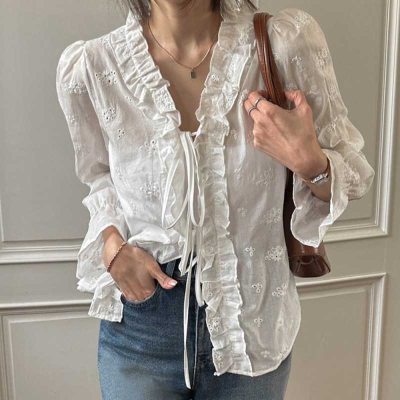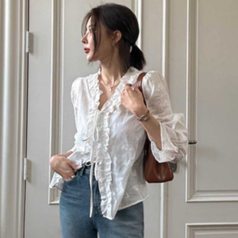 繊細な刺繍レースと華やかなフリル襟が印象的な白シャツです。