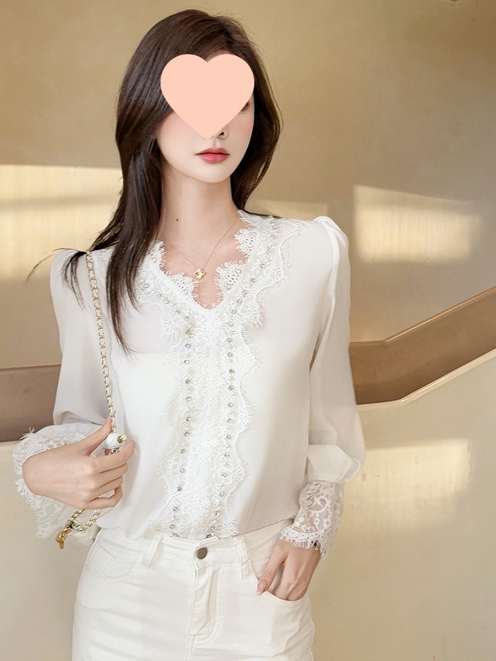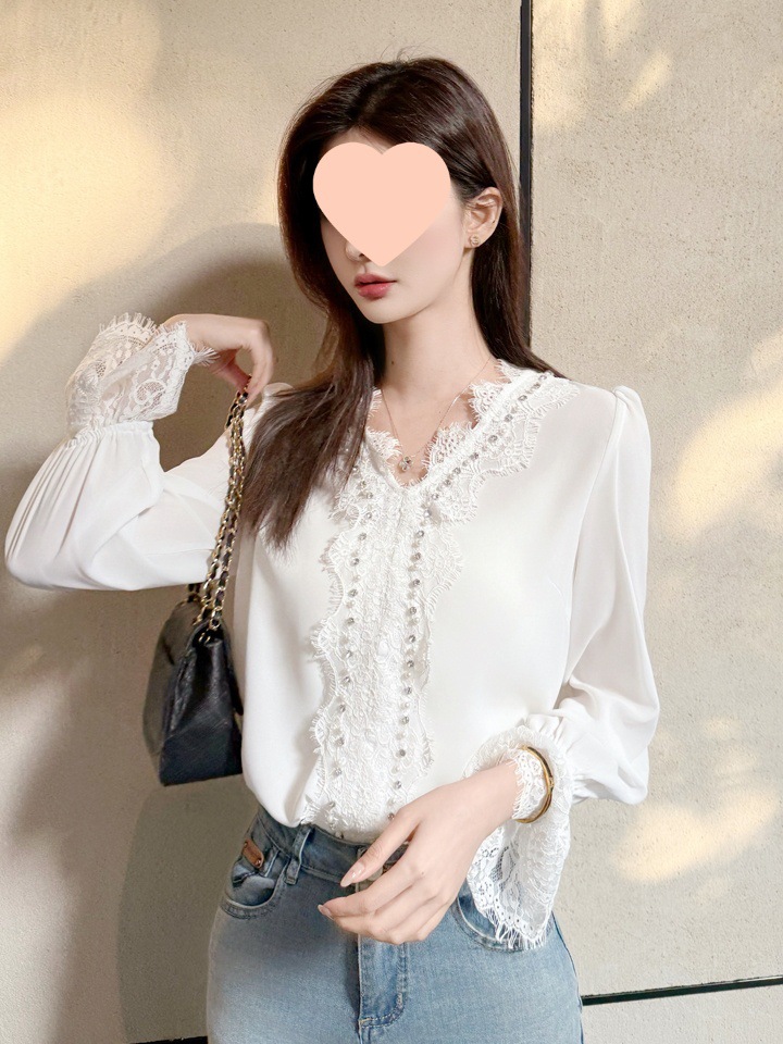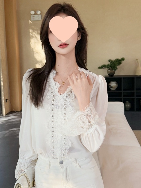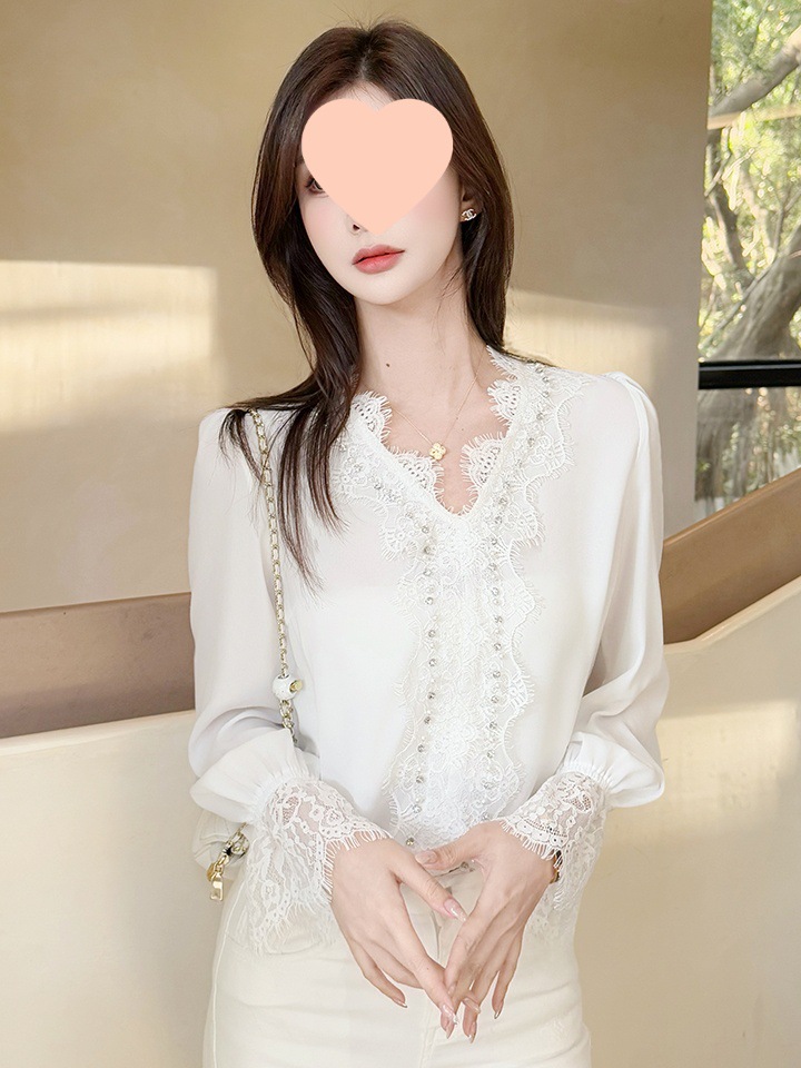胸元と袖口に施された繊細なレースが華やかさを演出する白シャツです。