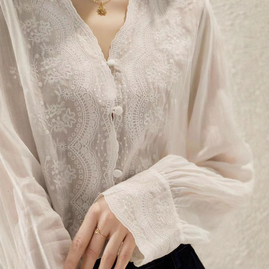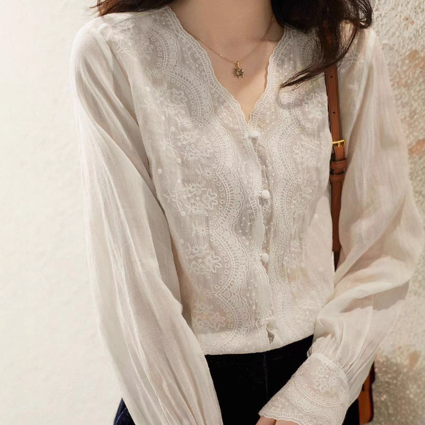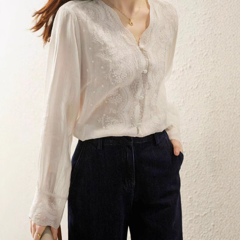 胸元に施された繊細な花柄刺繍のレースが上品な印象を与える白シャツです。
