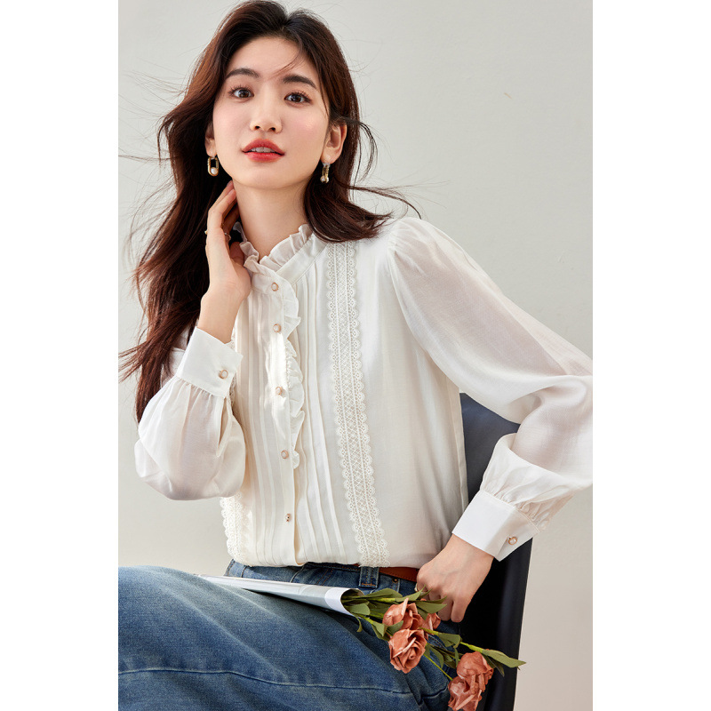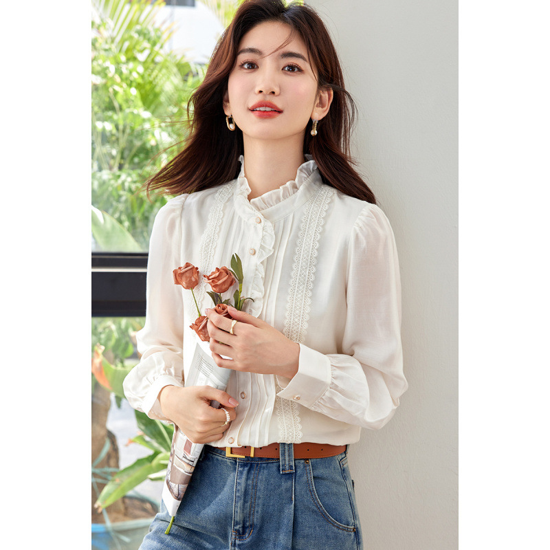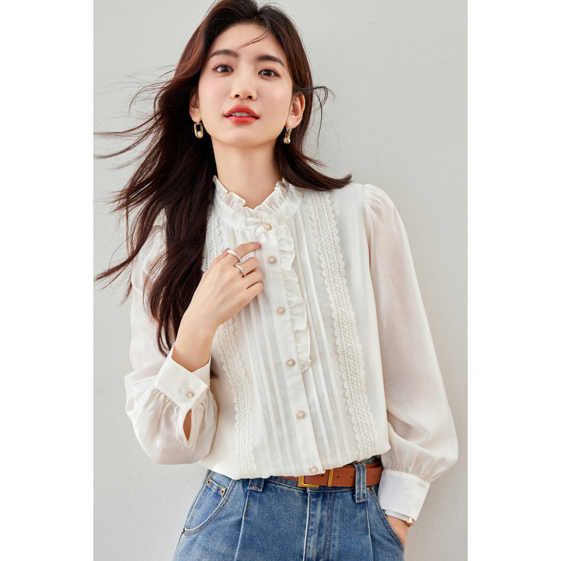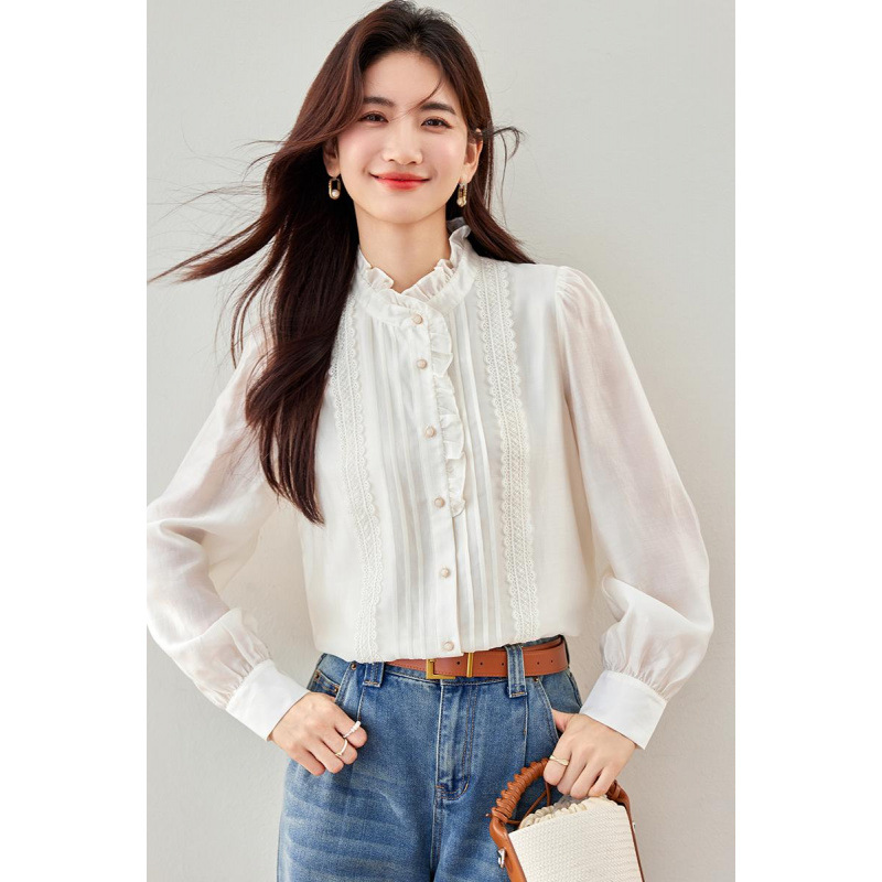 繊細なレースとピンタックが上品な印象を演出する白シャツです。