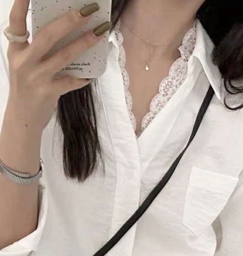 襟元に繊細なレースをあしらった上品な白シャツです。