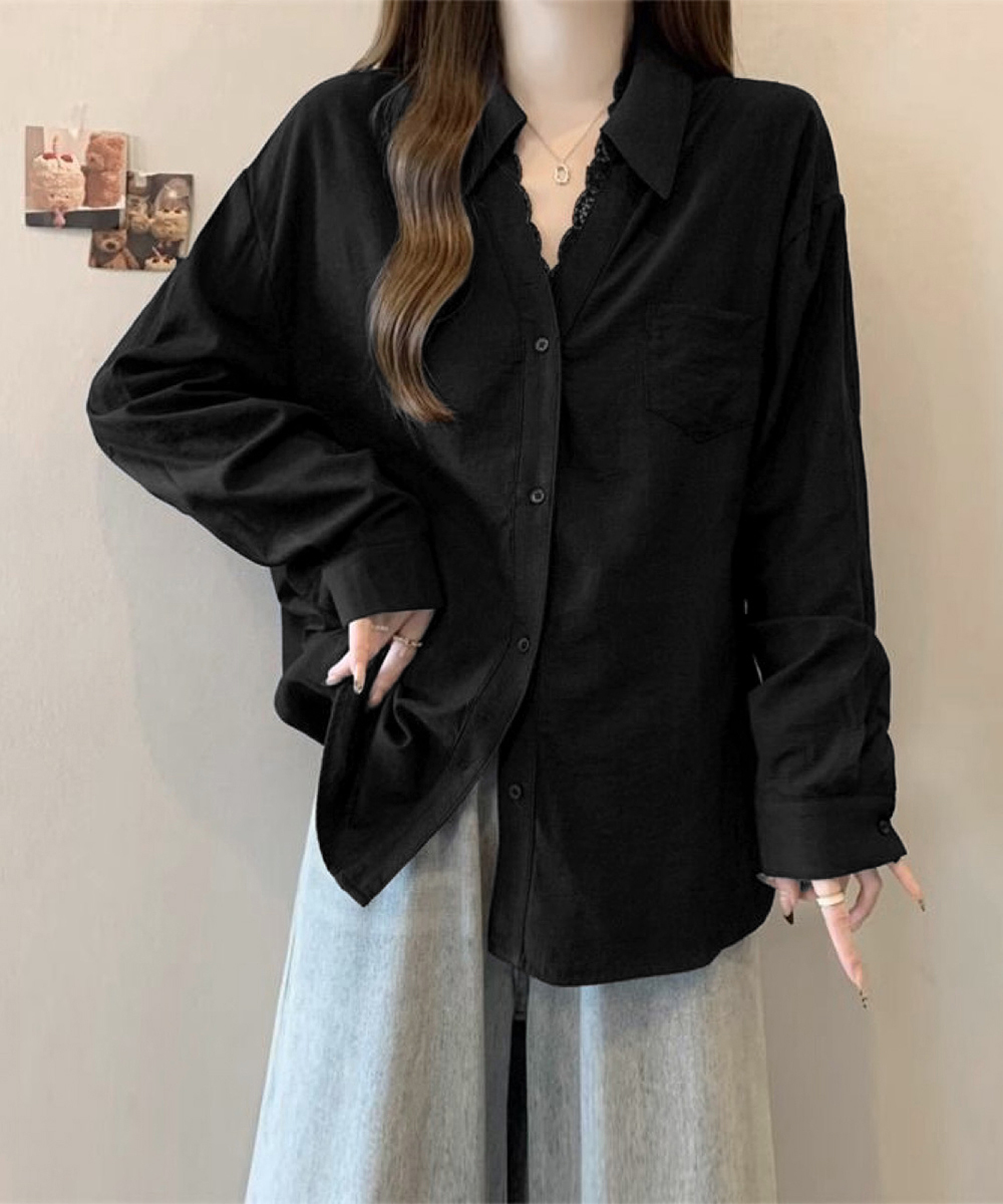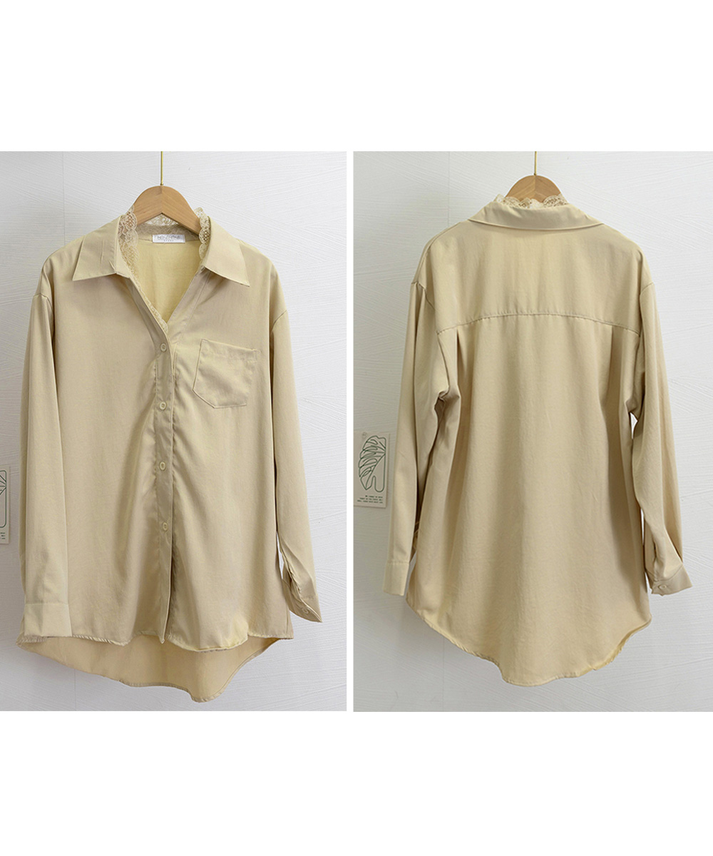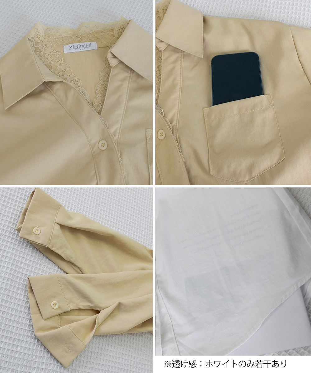 胸ポケット付きでカジュアル感も演出しつつ、レースが女性らしさを添える絶妙なバランス。