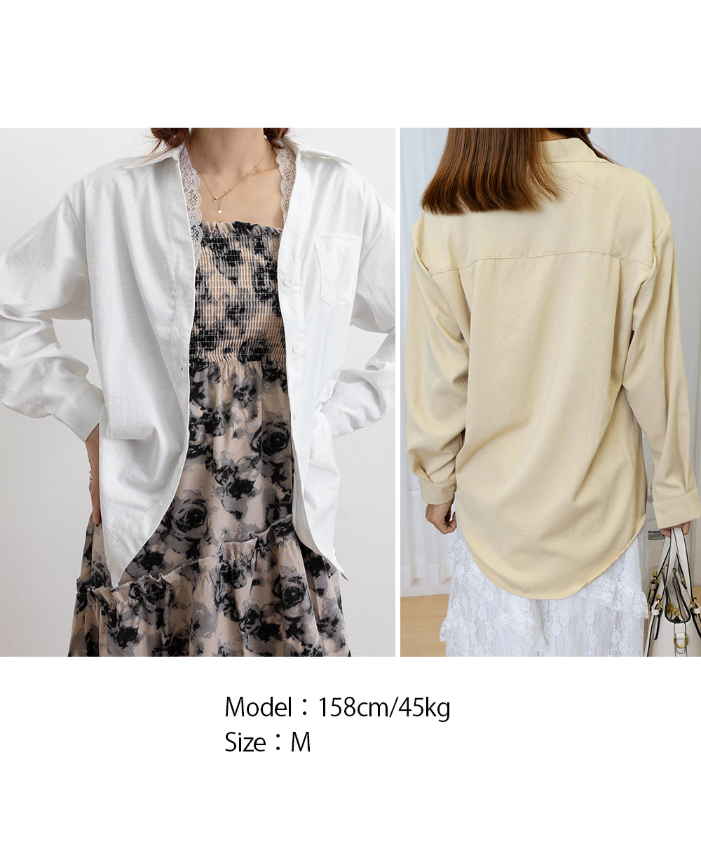 カラー:ブラック/ホワイト/ベージュ サイズ:M/L [M]着丈:前丈約67cm/後ろ丈約77cm 肩幅:約48cm 袖丈:約51cm ゆき:約75cm 身幅:約53cm 胸囲:約106cm [L]着丈:前丈約69cm/後ろ丈約79cm 肩幅:約50cm 袖丈:約53cm ゆき:約78cm 身幅:約56cm 胸囲:約112cm 裏地:なし 伸縮性:なし 透け感:ホワイトのみ若干あり