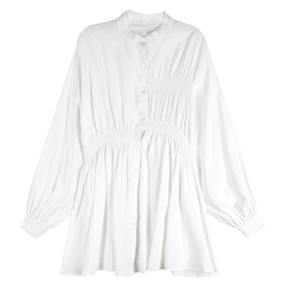 フロントギャザーが上品で、白シャツの清潔感を活かしたエレガントな仕上がり。