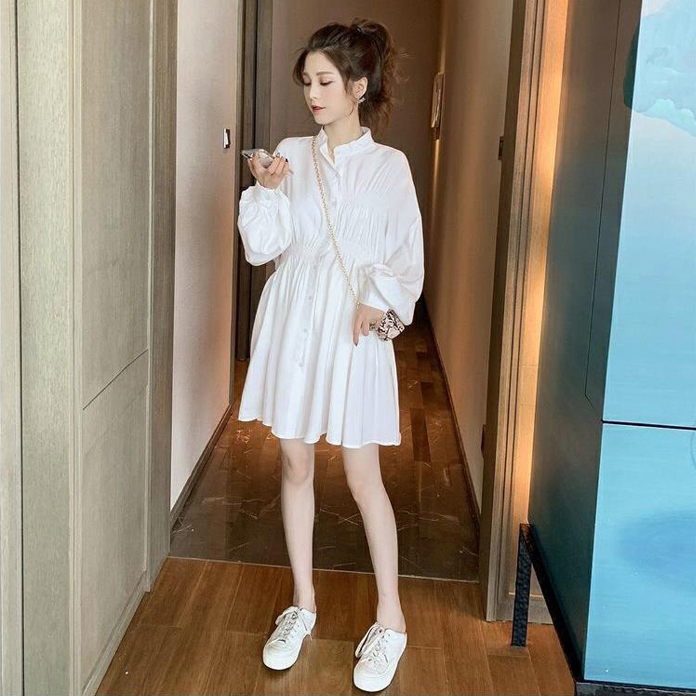 体型カバーが叶う白シャツベースのシャツワンピース。