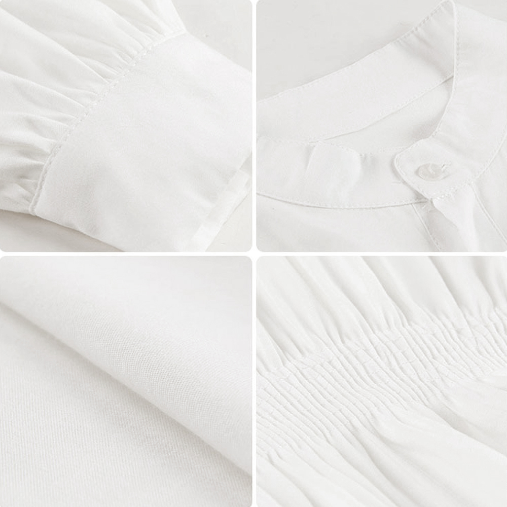 素材:ポリエステル100% カラー:ホワイト/ブラック サイズ:S/M/L [S]着丈:約80cm 肩幅:約46cm 袖丈:約53cm ゆき:約76cm 身幅:約47cm 胸囲:約94cm ウエスト:約62-122cm(ゴム仕様) ヒップ:約154cm [M]着丈:約80cm 肩幅:約47cm 袖丈:約53cm ゆき:約76.5cm 身幅:約49cm 胸囲:約98cm ウエスト:約64-124cm(ゴム仕様) ヒップ:約156cm [L]着丈:約80cm 肩幅:約48cm 袖丈:約53cm ゆき:約77cm 身幅:約51cm 胸囲:約102cm ウエスト:約66-126cm(ゴム仕様) ヒップ:約158cm 裏地:なし 伸縮性:なし 透け感:ホワイトのみ若干あり ※すべて平置きサイズです(採寸方法違いより、多少の誤差がございますので、ご了承ください)。