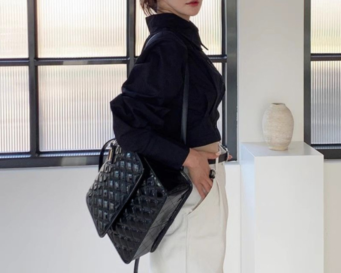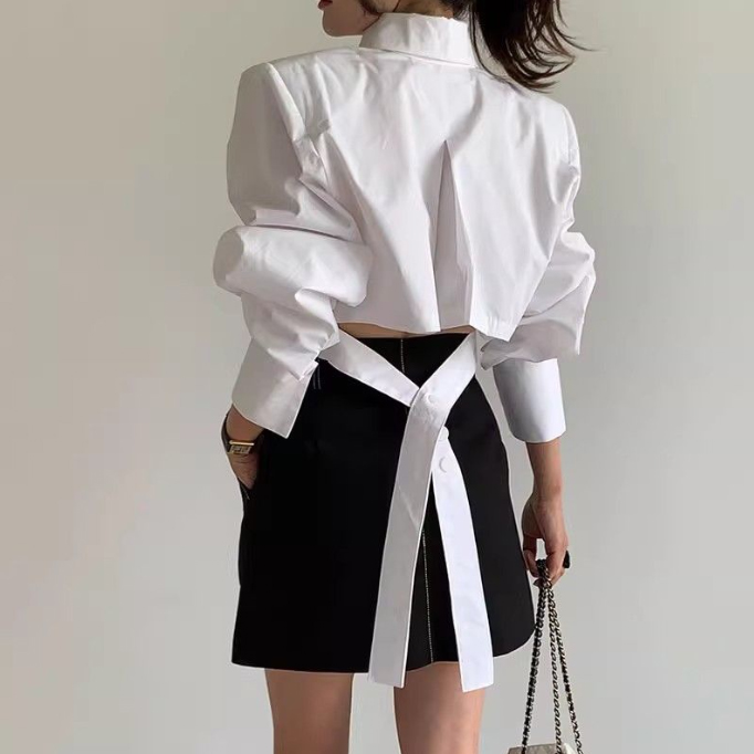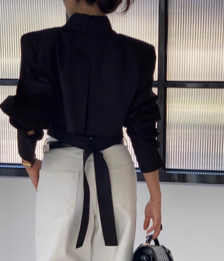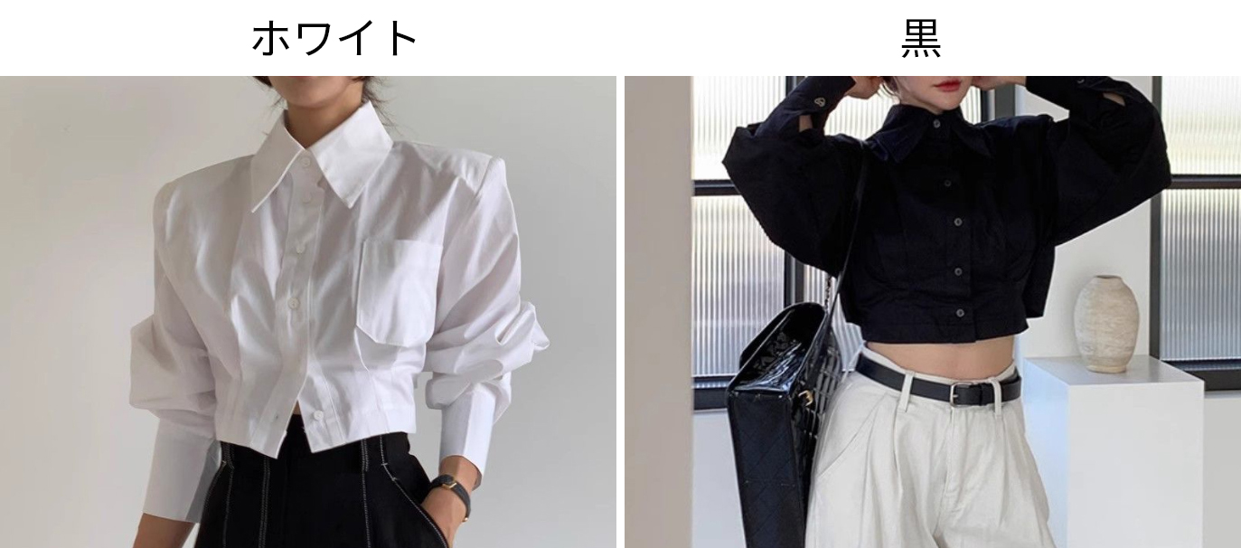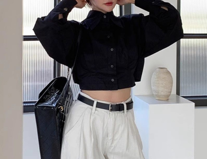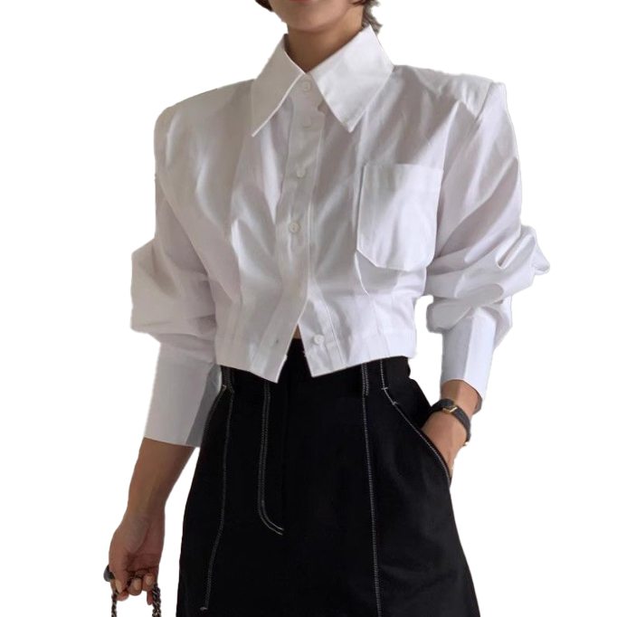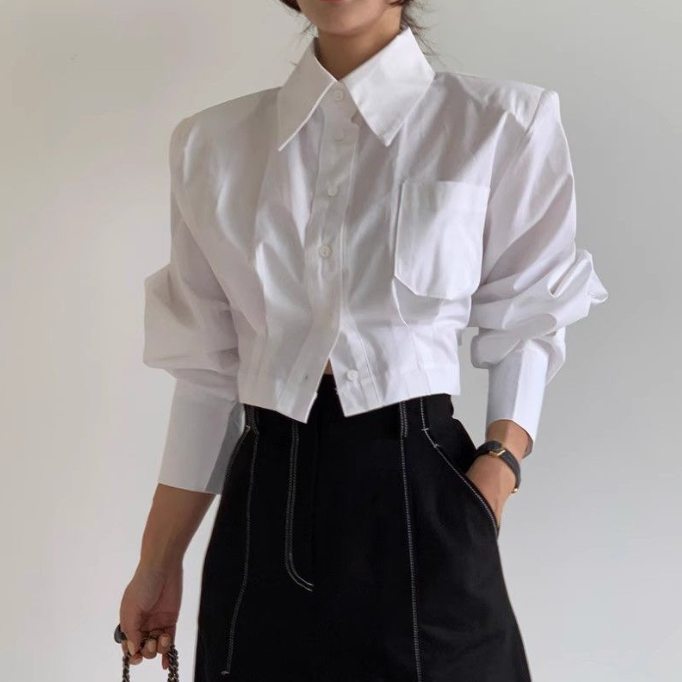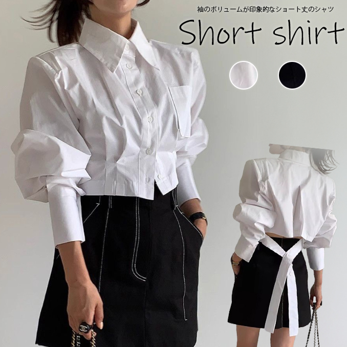 袖のボリューム感が印象的なショート丈の白シャツです。
