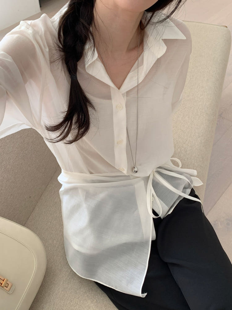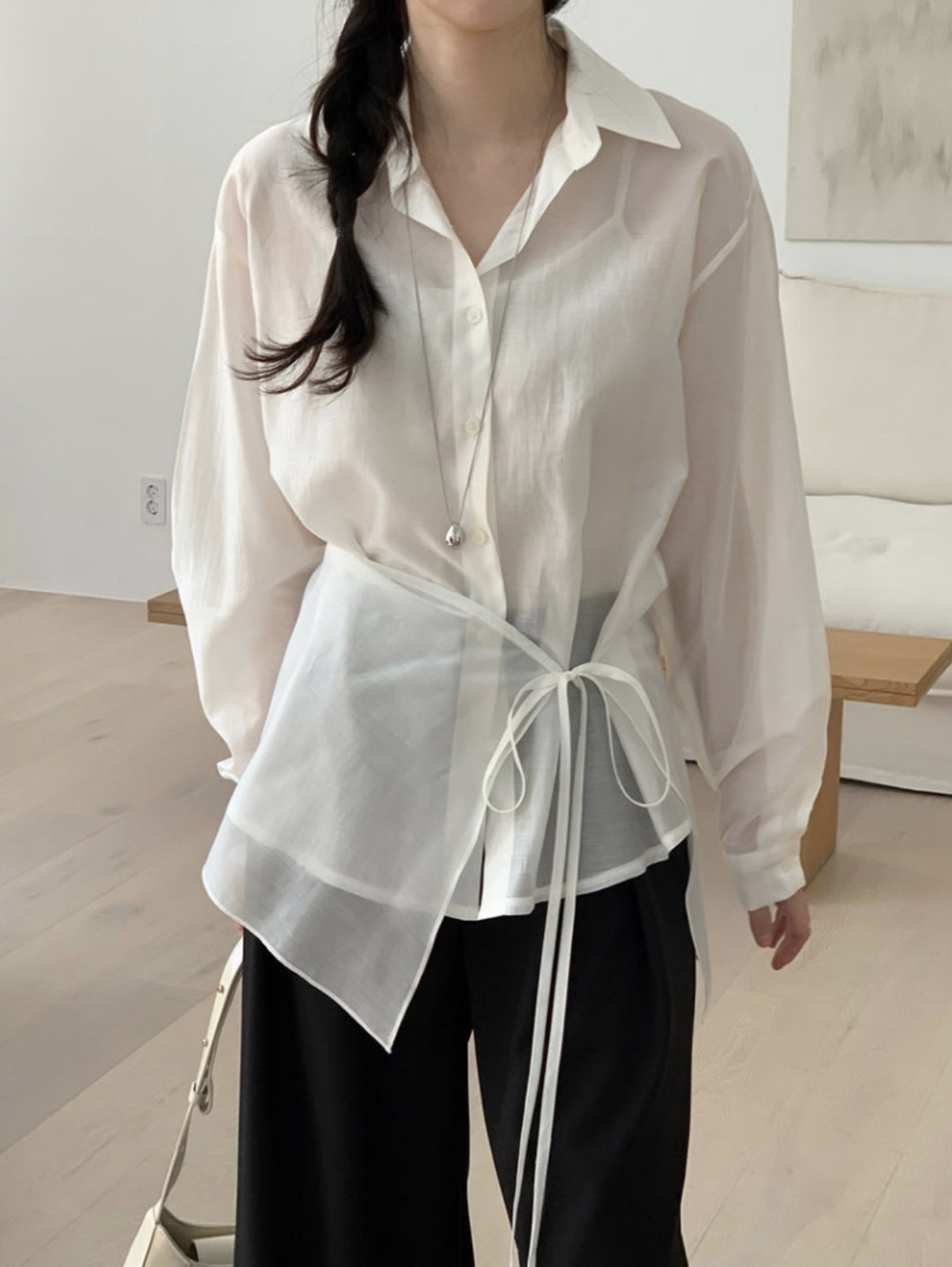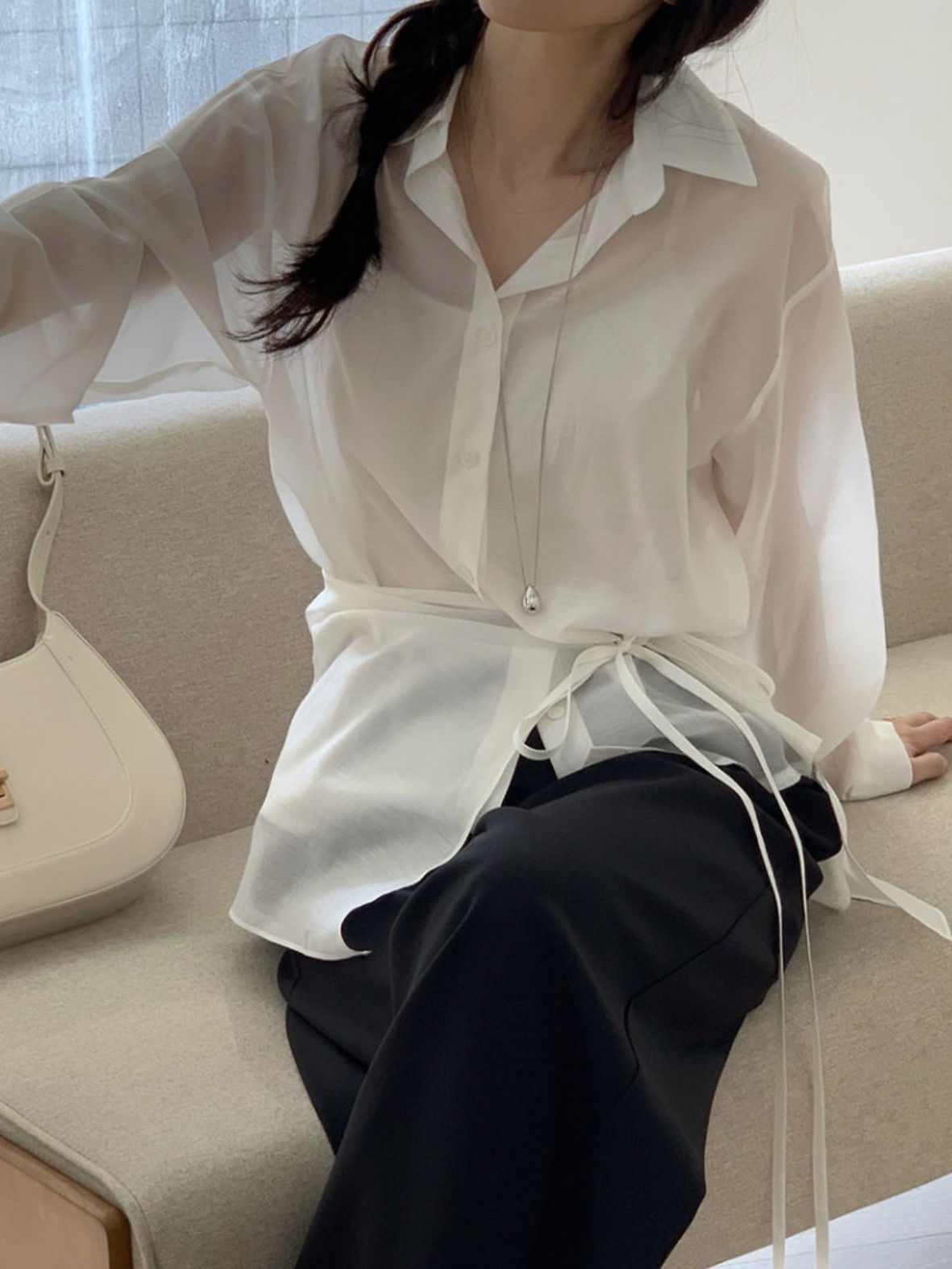 今季注目の韓国風デザインが魅力的な白シャツです。 アシメトリーなボタン配置と結び紐のアクセントで個性的なスタイリングを演出。 透け感のある素材で春らしい軽やかな印象に仕上げました。 上品な白シャツでありながら、トレンド感も兼ね備えた一枚です。