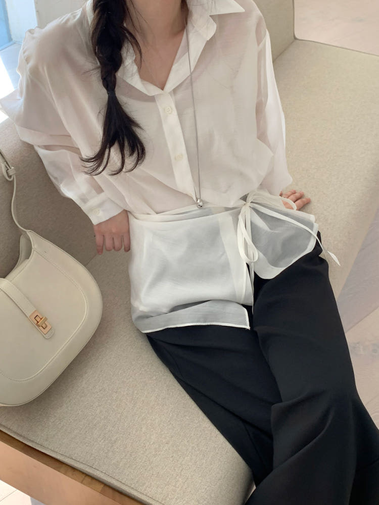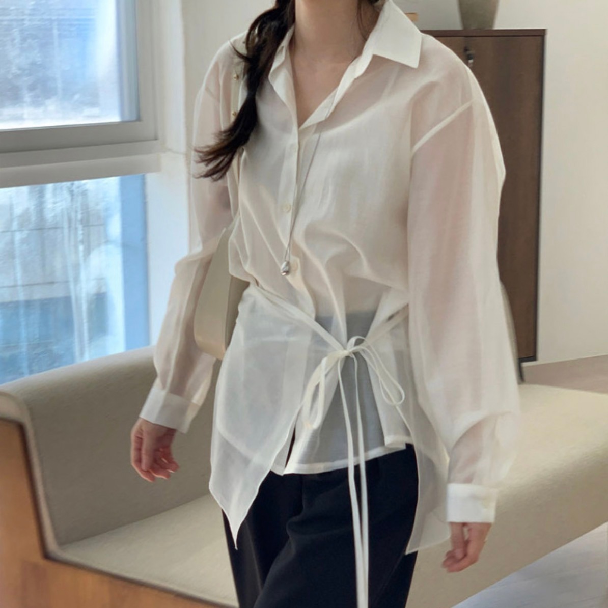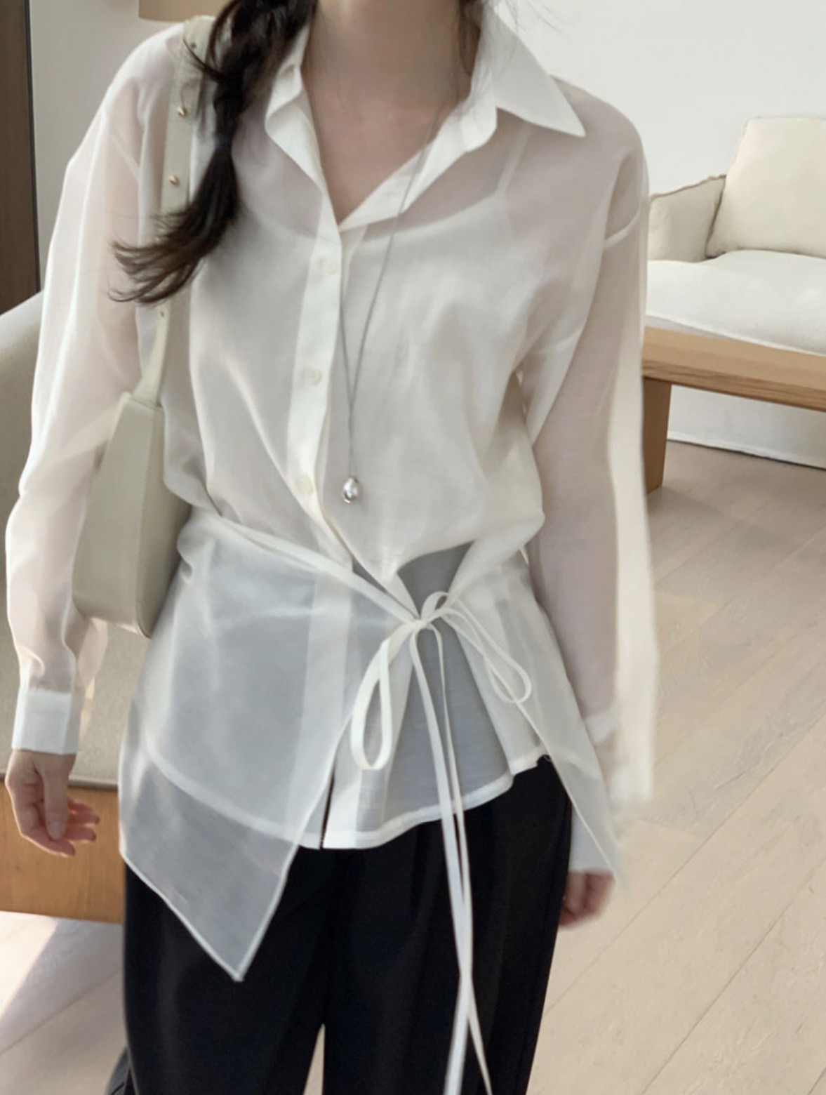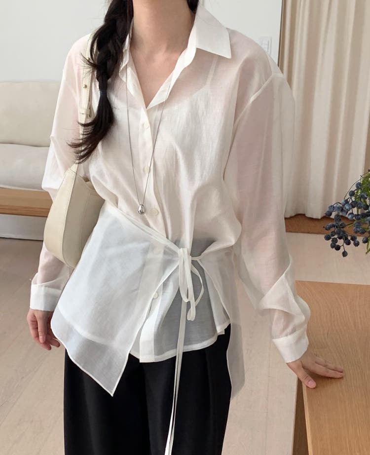 今季注目の韓国風デザインが魅力的な白シャツです。 アシメトリーなボタン配置と結び紐のアクセントで個性的なスタイリングを演出。 透け感のある素材で春らしい軽やかな印象に仕上げました。 上品な白シャツでありながら、トレンド感も兼ね備えた一枚です。