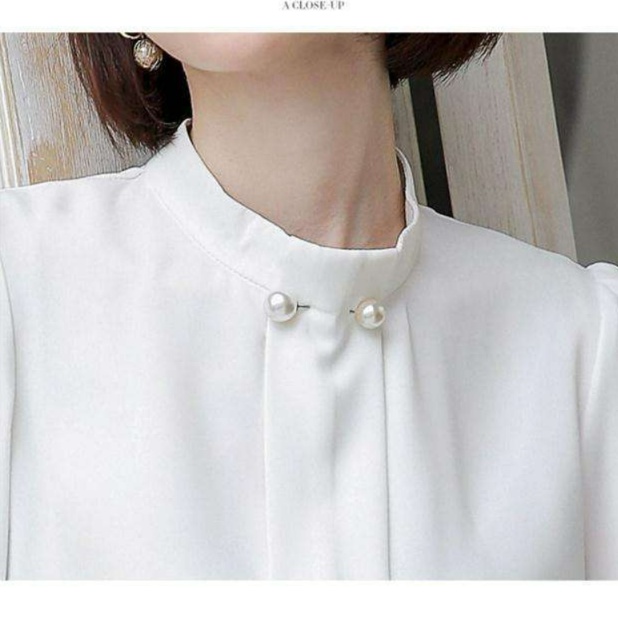首元のパール調ボタンが上品な雰囲気を演出し、フォーマルな場面でも映える