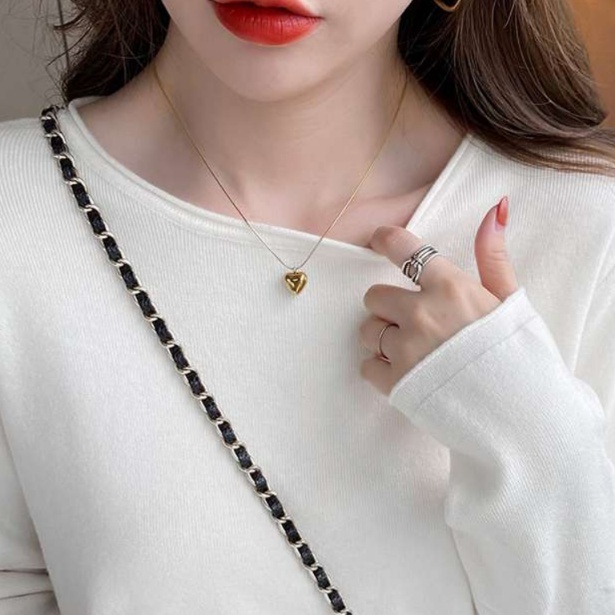 程よい開きの襟ぐりがネックレスやチェーンバッグとの相性抜群で、おしゃれ度をアップ
