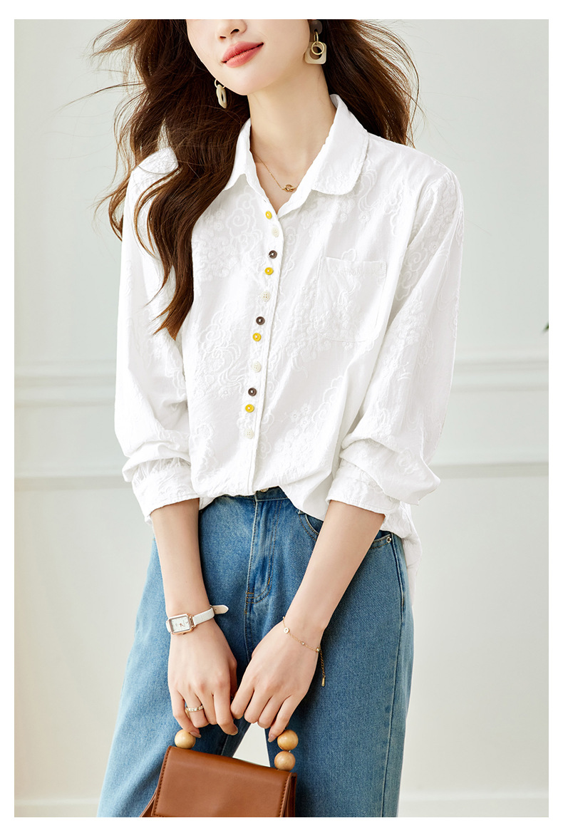 カジュアルにもフォーマルにも対応できる万能な一枚で、胸元の刺繍デザインが女性らしさを引き立てます。