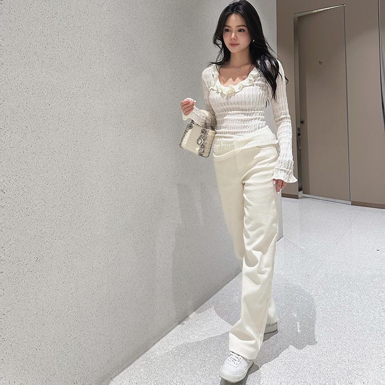 優雅さとリラックス感を兼ね備えたデザインが特徴的です。柔らかなニット素材が心地よい着心地を提供し、伸縮性にも優れているため、体のラインに美しくフィットします。メローレースのディテールが、シンプルなデザインに華やかさを加え、女性らしさを引き立てます。レース部分は、袖口や裾にあしらわれ、微細な波打つようなラインが優しい印象を与えます。シンプルな白シャツにレースを取り入れることで、普段使いにはもちろん、オフィススタイルやカジュアルデートにもぴったり。ベーシックながらも一味違うスタイルに仕上がります。軽やかなニット素材は、春先や秋口のちょっとした肌寒い日にも重宝します。軽やかな着心地ながら、レースが存在感を放ち、アクセサリーがなくても存在感のあるコーディネートが完成します。また、シンプルなデニムやスカートと合わせるだけで、上品で洗練された印象を作り出せます。このニットプルオーバーは、デイリーのコーディネートに華やかさをプラスするアイテム。気取らない優雅さを求める女性にぴったりの一枚です。